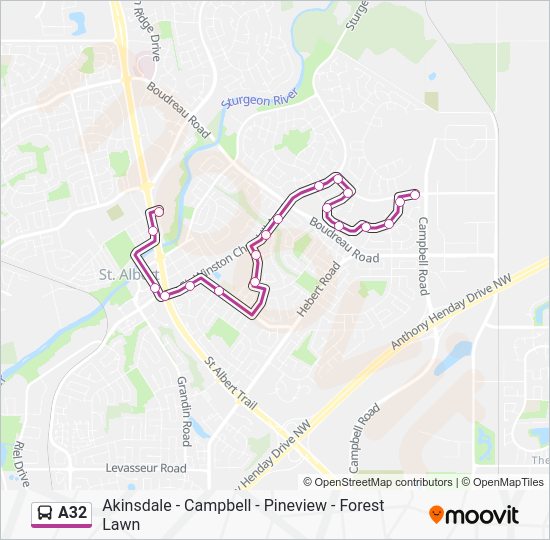 The first stop of the A32 bus route is St. Albert Centre Exchange and the last stop is Poirier Ave & Campbell Rd. A32 (Campbell) is operational during weekdays.