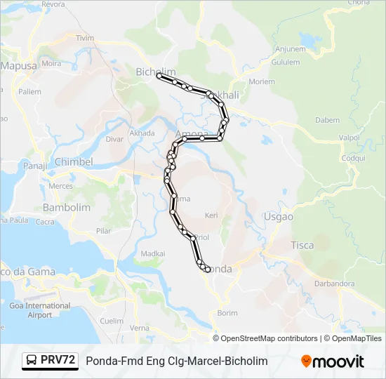 Track line PRV72 (Ponda-Fmd Eng Clg-Marcel-Bicholim) on a live map in real time and follow its location as it moves between stations. Check its running status to see if it's on time or delayed. Use Moovit as a line PRV72 bus tracker or a live Kadamba Transport Corporation Ltd. bus tracker app and never miss your bus.