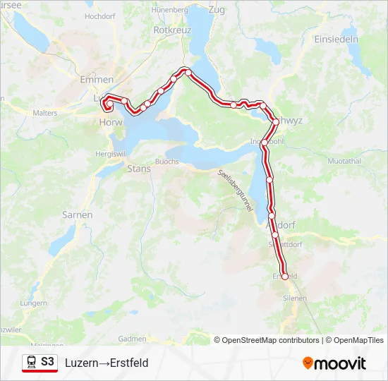 Track line S3 (Luzern→Erstfeld) on a live map in real time and follow its location as it moves between stations. Use Moovit as a line S3 train tracker or a live Schweizerische Bundesbahnen SBB (Rail) train tracker app and never miss your train.