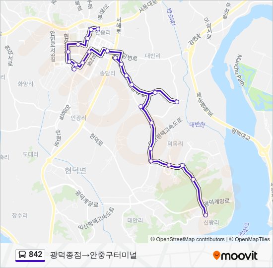 842 버스 경로의 첫 번째 정거장은 광덕종점이며 마지막 정거장은 안중구터미널 입니다. 842 (광덕종점→안중구터미널)은 매일 간 운영됩니다.