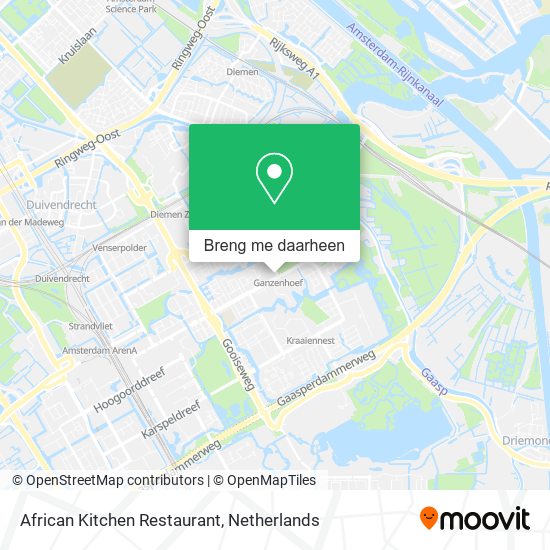 Het dichtstbijzijnde metro station bij African Kitchen Restaurant in Amsterdam is Ganzenhoef. Het is 5 min lopen.