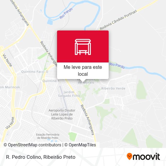 A estação de ônibus mais próxima de R. Pedro Colino em Ribeirão Preto é R. Pedro Colino. Fica a 2 min de caminhada.