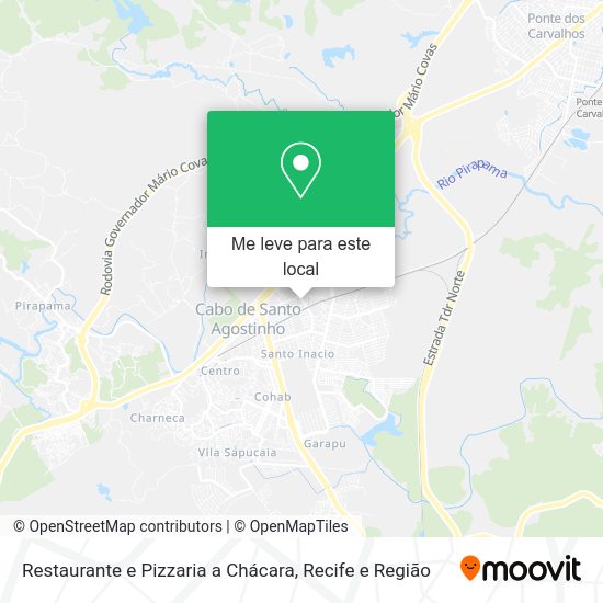 Facilitamos a sua viagem até Restaurante e Pizzaria a Chácara e é por isso que mais de 1.5 milhões de usuários, incluindo os usuários de Cabo De Santo Agostinho, confiam no Moovit como o melhor aplicativo de transporte público. Você não precisa baixar um aplicativo de ônibus ou trem separadamente, o Moovit é um app de mobilidade urbana completo, que te ajuda a encontrar os melhores horários disponíveis de ônibus ou trem.