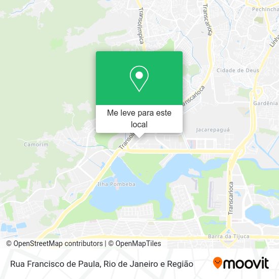 Facilitamos a sua viagem até Rua Francisco de Paula e é por isso que mais de 1.5 milhões de usuários, incluindo os usuários de Jacarepaguá, confiam no Moovit como o melhor aplicativo de transporte público. Você não precisa baixar um aplicativo de ônibus ou trem separadamente, o Moovit é um app de mobilidade urbana completo, que te ajuda a encontrar os melhores horários disponíveis de ônibus ou trem.