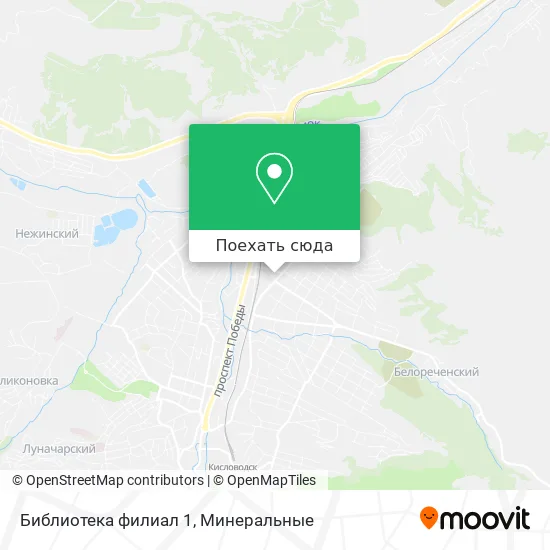 Ближайшая станция поезд к Библиотека филиал 1 в городе Малокарачаевский Район - это Кисловодск. До нее 8 мин пешком.