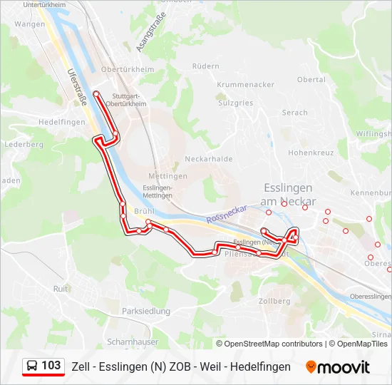 Первая остановка для автобус 103 - Zell (Essl.) Albblick, а последняя остановка - Mercedes-Benz. Маршрут 103 (Mercedes-Benz) работает в вторник, воскресенье.